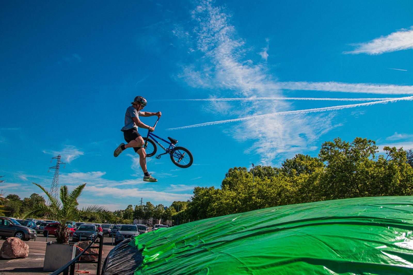 Ein junger Geislinger Skater hebt in Montceau-les-Mines mit seinem BMX-Rad beim „Urban-Day“ ab. Gelebte Städtepartnerschaft bei strahlendem Sonnenschein. Foto: Stadtjugendring Geislingen e.V.